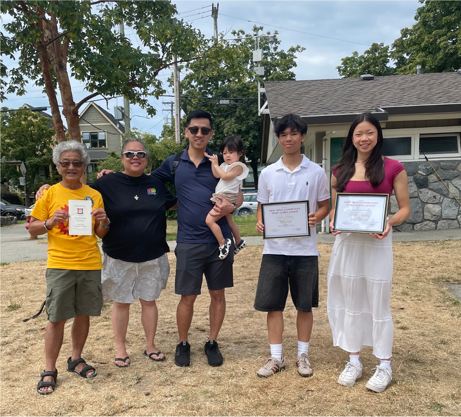 Eric Ming Community Hero Scholarship Awards were also handed out to two of our Strathcona Interactors Chloe Huang and Alex Lui who are pictured below with Ron, youth champion Mitra Tshan, Eric’s brother Alex and his daughter Mia.